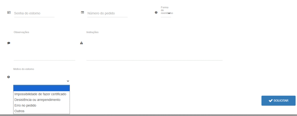 Na tela de solicitação de reembolso foi adicionado o campo “motivo de estorno” com as opções solicitadas.