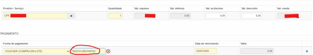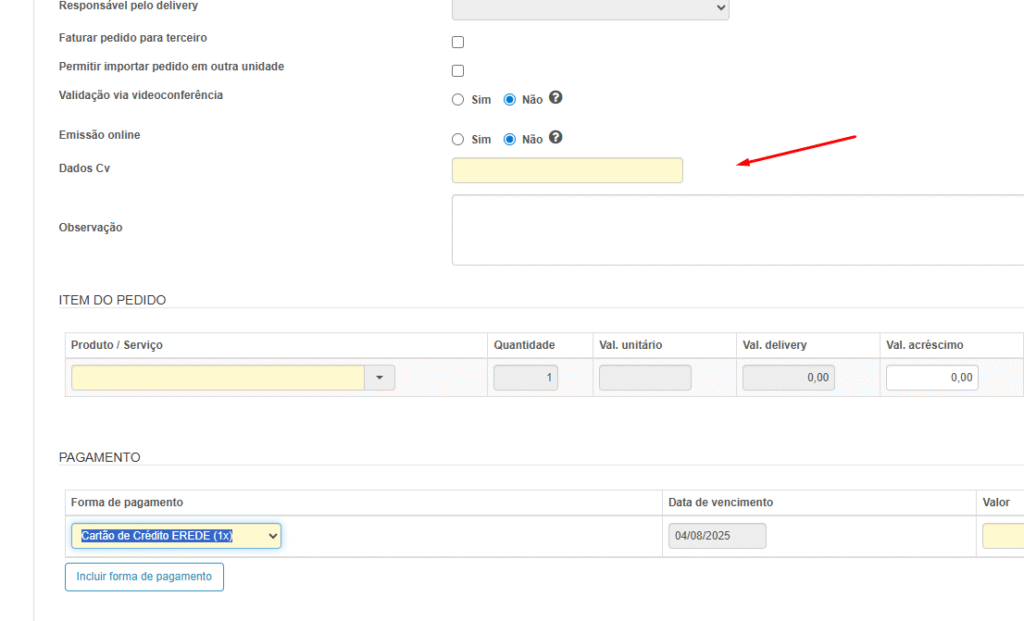 Além disso, na tela de criação de pedido venda foi adicionado um novo campo, condicionado ao parâmetro “Obrigar informar NSU no pedido venda“, uma vez que ao criar o pedido for selecionada uma forma de pagamento que contenha essa marcação o campo “Dados cv“ será exibido: