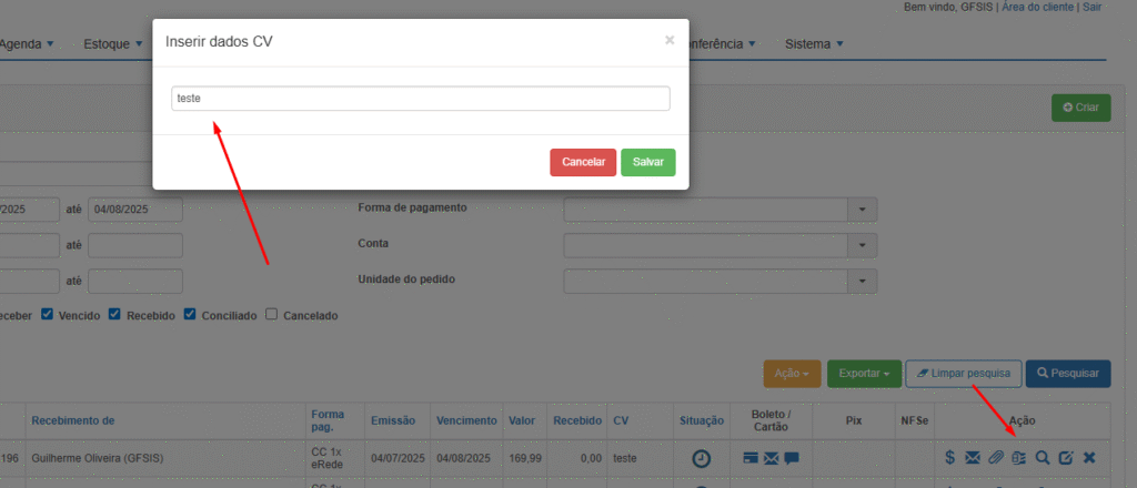 OBS: O campo adicionado na tela de pedido venda, não salva o dado em si no banco , este campo é um espelho do que está armazenado no contas a receber. Portanto, um pedido já criado, não será possível de editar os dados do cv diretamente na tela de criação do pedido, caso necessário deverá ser editado pelo ícone na listagem de pedido venda ou do contas a receber: