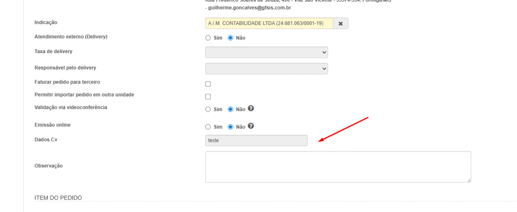 Ao salvar o pedido, a informação do campo será salva diretamente no documento do contas a receber: