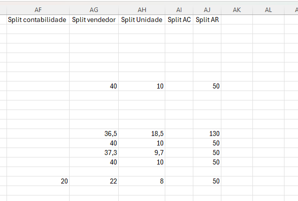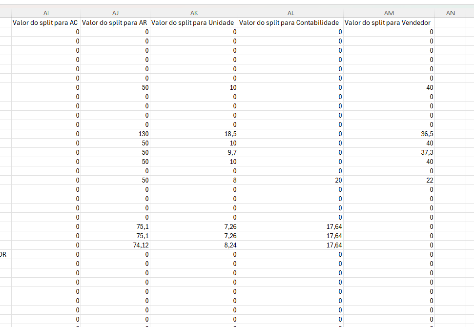 Ajustado para exportar os campos de split no excel completos, com Contabilidade, Vendedor, Unidade. AC e AR.