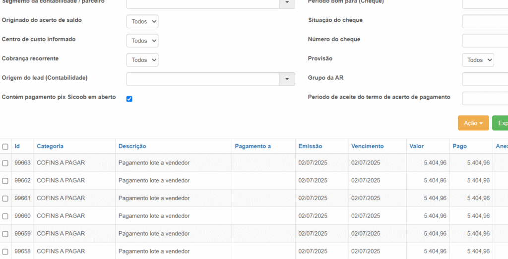 Adicionamos um filtro na tela de contas a pagar, chamado “Contém pagamento pix Sicoob em aberto“.