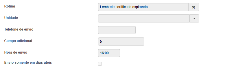 Foi feita a alteração para quando a flag “envio somente em dias úteis” estiver desmarcada, o sistema enviará apenas mensagem de cliente que o certificado expirará exatamente no dia preenchido no campo adicional.