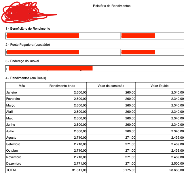 Formato para o inquilino: Somente a relação dos valores que ele pagou de aluguel.