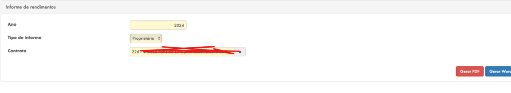 O filtro do relatorio é: Ano, Tipo (Inquilino ou proprietário) e o contrato que pode ser pesquisado tanto pelo nome do cliente quanto pelo nome do proprietario.