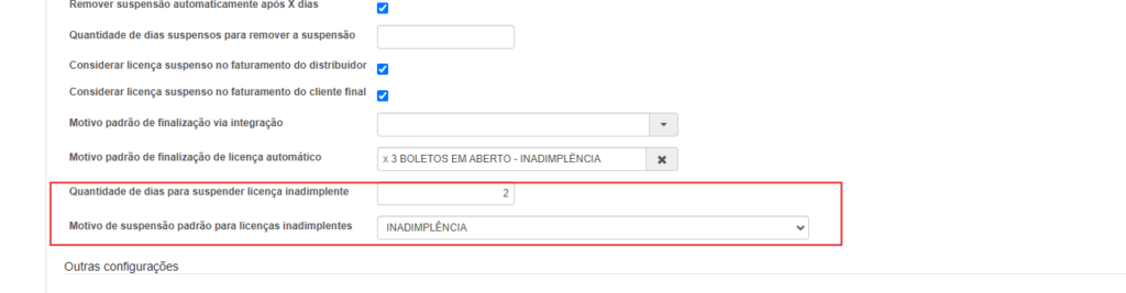 Foi incluido 2 parametros do sistema um para configurar quantos dias depois de inadimplentes, neste caso o sistema considera primeiro a quantidade de dias para tornar o contrato inadimplente que é o parametros (Dias de atraso para considerar licença inadimplente), se configurar com 1 por exemplo, ai se atrasar por exemplo o boleto por 1 dia no segundo dia o contrato passa a ficar inadimplente. Esse novo parametro para suspender a licença considera essa inadimplencia do contrato, então se preencher com 0, no mesmo dia que o contrato ficar inadimplente ele vai ser suspenso, se colocar 1 dia no dia seguinte que ele vai ficar suspenso. A suspensão é feita por um job que é executado diariamente as 10:30 da manhã.