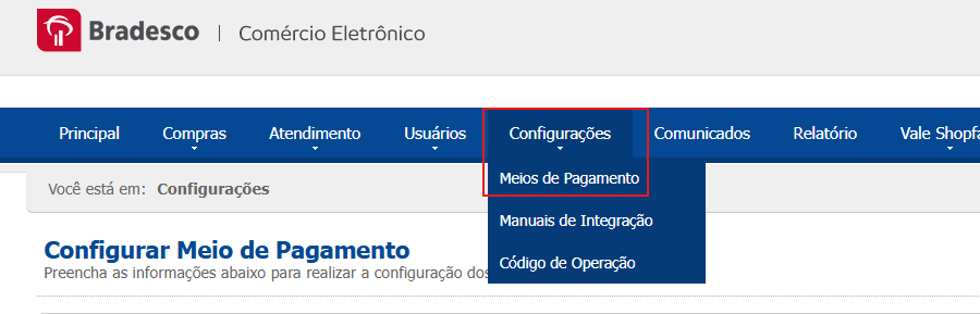 Dentro do portal o cliente deve se direcionar até Configurações – Meios de pagamento