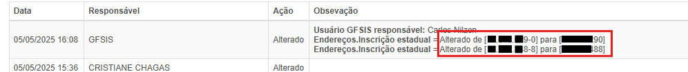 Analisando o cenário apresentado, foi observado que o faturamento foi feito no inicio do dia 05 de maio, às 8:06, nesse dia pela manhã, as IEs do cliente continham mascaras, enquanto no contrato estavam sem mascara.