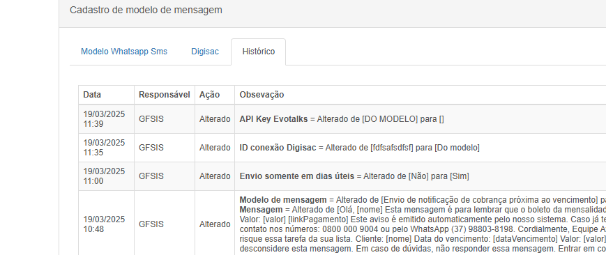 Tratativas feitas em relação á configuração de mensagem de WhatsApp no GFSIS Controle: