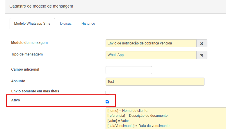 2° – Adicionado o campo para ativar/desativar o modelo de mensagem de WhatsApp: