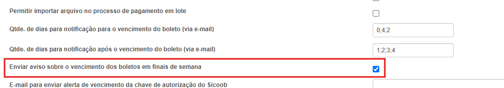 4° – Adicionado um novo campo nos parâmetros do sistema, que irá informar se envia ou não mensagens de notificação de vencimento de boleto aos fins de semana.