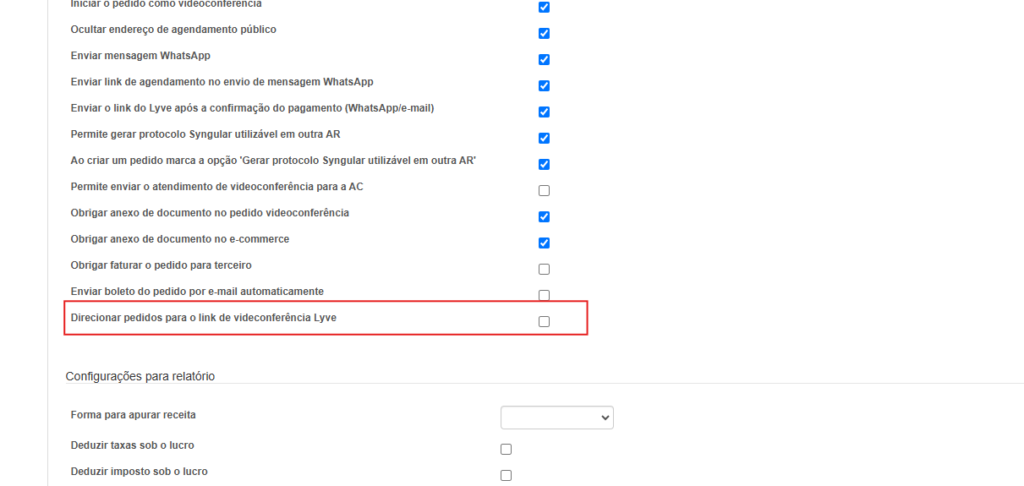 Foi criado uma nova marcação no cadastro da unidade para direcionar o link de videoconferência para o atendimento Lyve de todos os pedidos da unidade em questão
