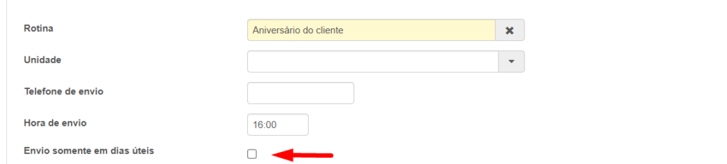 Envio somente em dias úteis → Disponível em todos os modelos de mensagem. Ao marcar esse campo, será validado se a data atual é fim de semana ou feriado. Não sendo dia útil, a mensagem não é enviada.