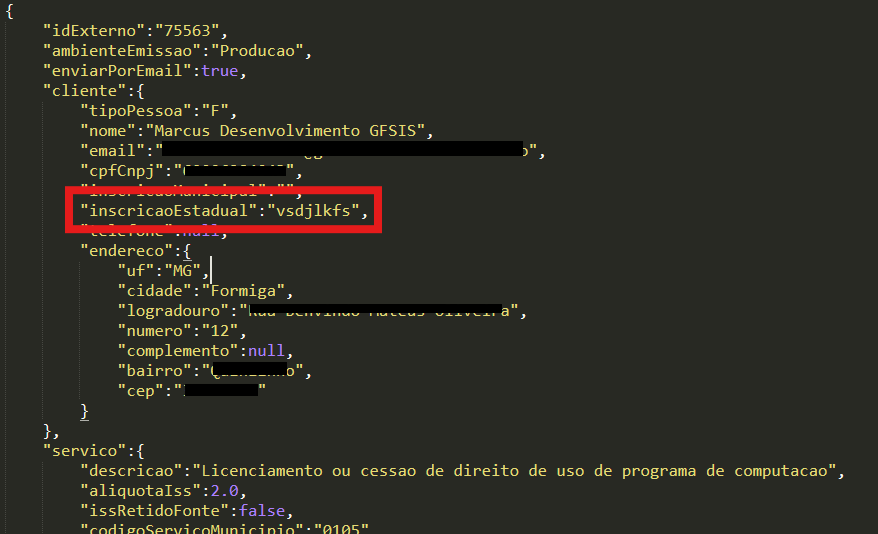 Acima o JSON que enviamos ao E-notas com as a inscrição estadual com o valor informado no item que foi faturado separadamente.