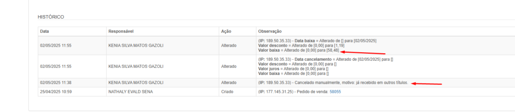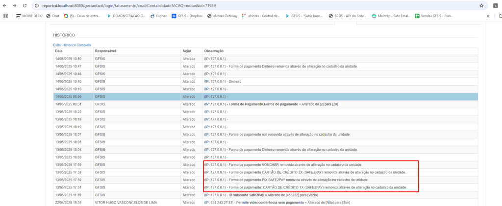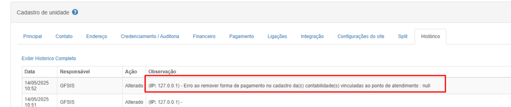 • Um registro será salvo no histórico de cada contabilidade afetada, indicando quais formas de pagamento foram removidas. Caso ocorra algum erro durante a remoção, será registrado no histórico da unidade.