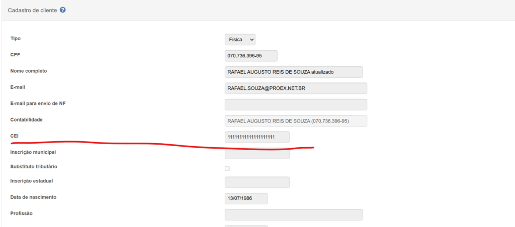 Agora no cadastro do cliente o campo CEI, também estará visível para integração Syngular, essa informação também é atualizada na integração entre AR e AC para contemplar a geração de protocolos para AR Única