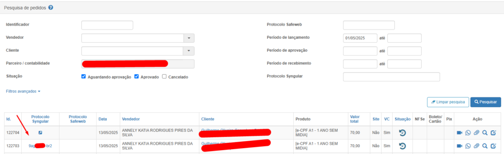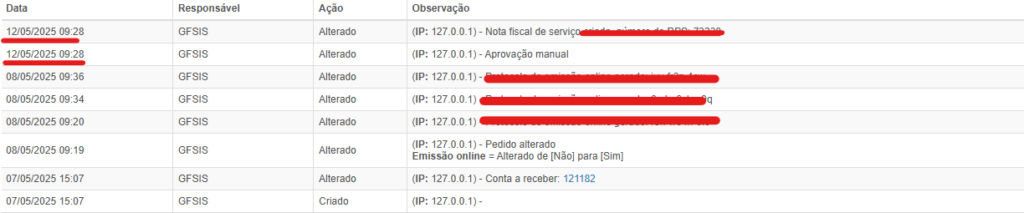 Histórico de aprovação de um pedido, após as 09:28 do mesmo dia, do mesmo cliente sem tentativa de envio de email.