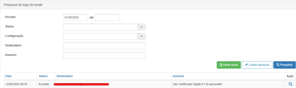 Log de envio de emails, último email enviado ao mesmo cliente as 09:25, anteriormente a alteração no cadastro do cliente.