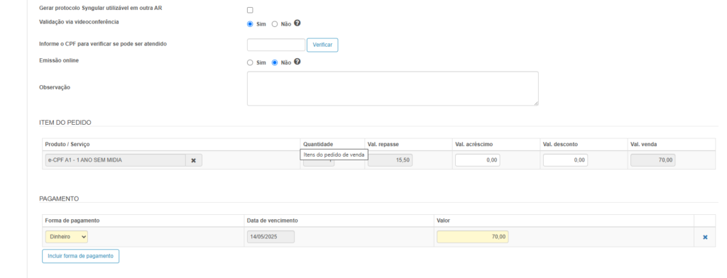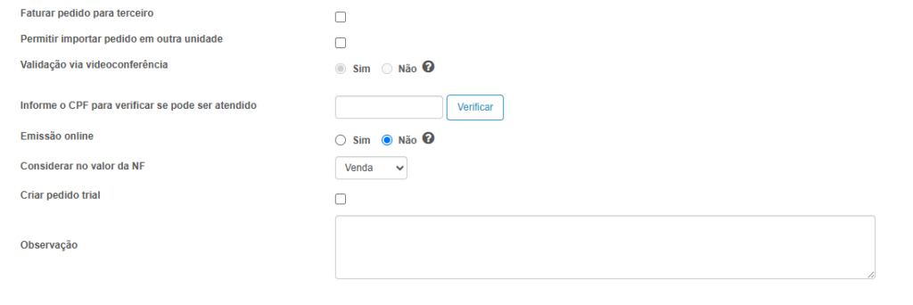 Quando esta contabilidade estiver criando ou editando um pedido venda a opção “validação por videoconferência” não poderá ser editado e estará marcado como “sim”.