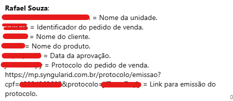 Para envio correto da mensagem com link para emissão do protocolo, o campo “Url emissão Syngular” em Parâmetros do Sistema → Pedido de Venda, deve estar preenchido com a url correta, e no caso ela não se encontrava preenchida.