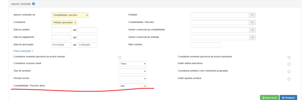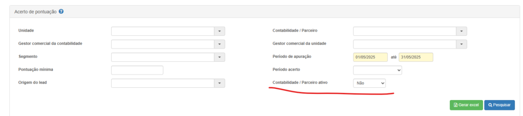 Foi criado o filtro de Contabilidade / Parceiro ativo nas rotinas de acerto de pontuação e acerto de comissão