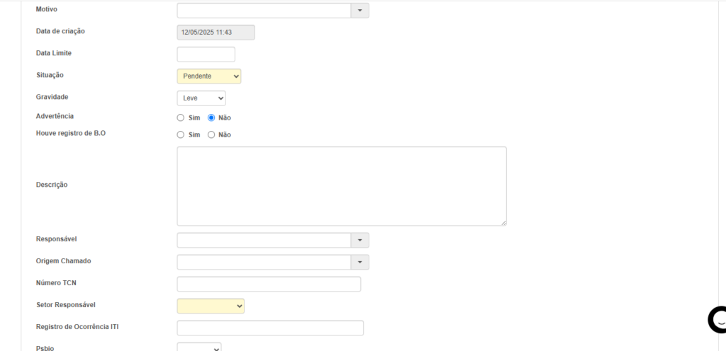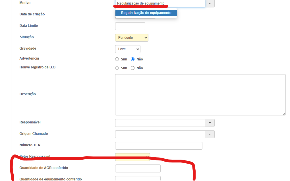 Quando o motivo é preenchido com “Conferência de equipamentos dos AGRs”, os campos aparecem corretamente.