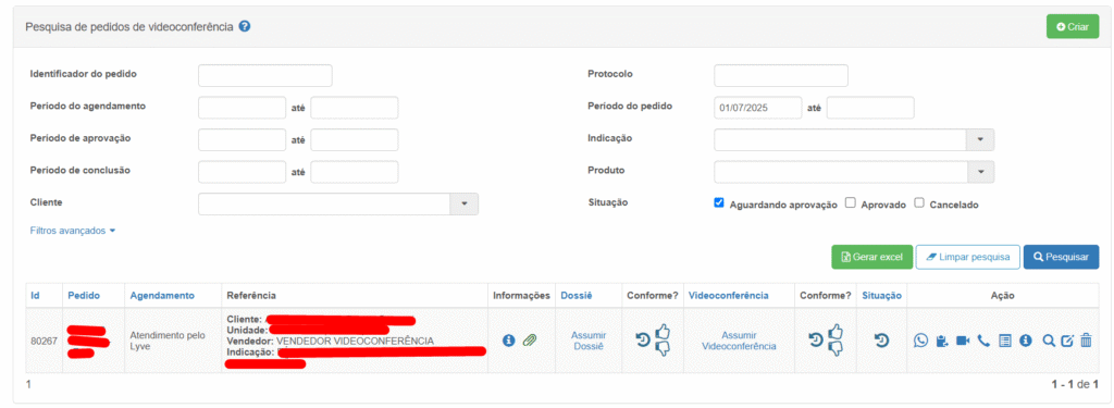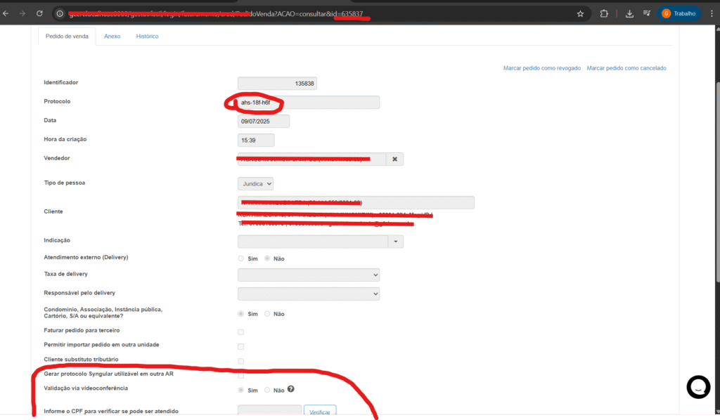 2) Na etapa de validação, uma vez que se tenha anexado o documento, além de gerar protocolo e enviar a documentação ao Sync, é criado também um registro de videoconferência amarrado ao pedido.