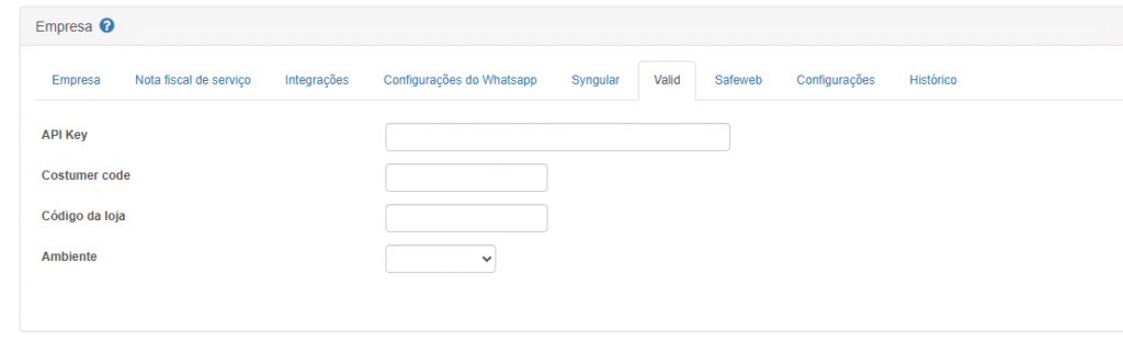 Essas informações devem ser solicitadas a Valid e ao retornadas devem ser alimentadas aqui, sendo a primeira solicitação a API Key e o Customer Code