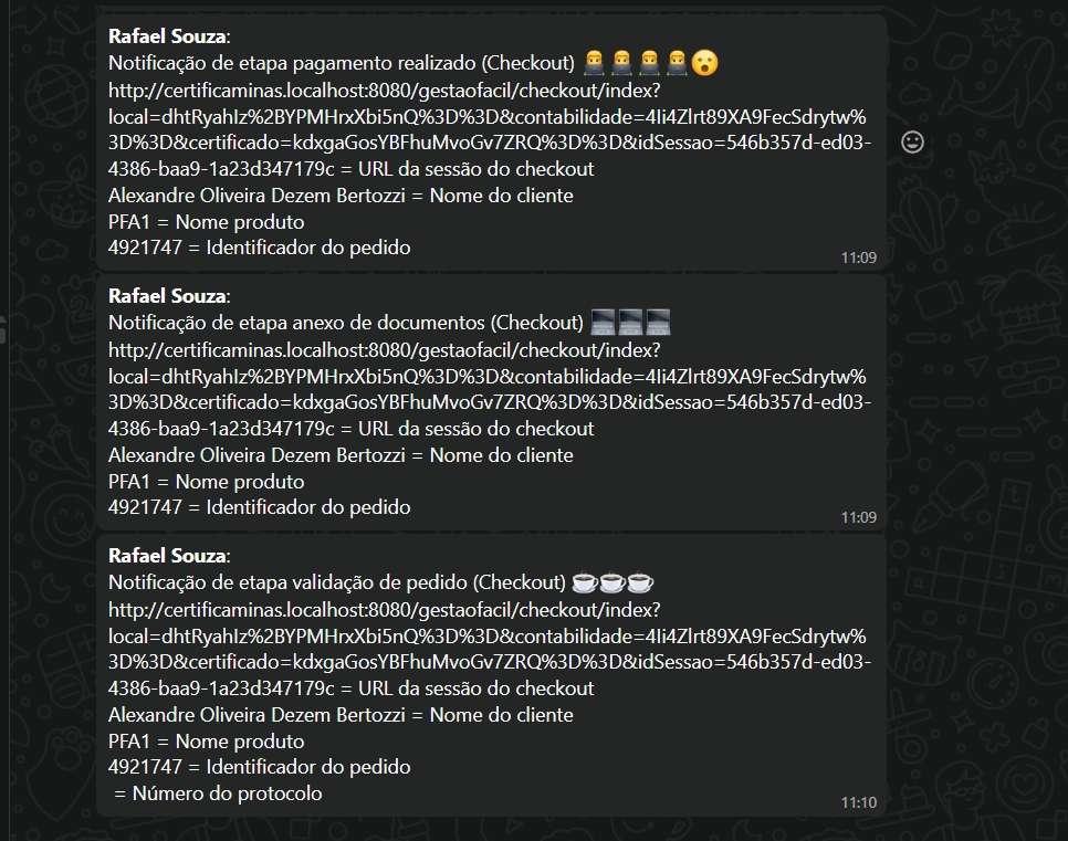 1) Criados as rotinas de envio de mensagem para cada etapa do checkout. Tal como funciona no envio de e-mail, se a rotina for devidamente configurada e preenchida com as TAG’s, é disparado um modelo de mensagem para o telefone do cliente via WhatsApp.