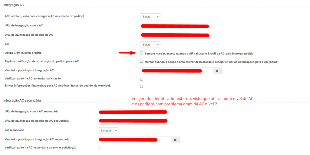 No contexto relatado, o identificador externo era sempre gerado (mesmo que não estivesse marcado “Utiliza CRM próprio“)pois, ao processar o retorno do envio do pedido para a “AC”, a variável nivelAC era preenchida, visto que o sistema é multiAc.