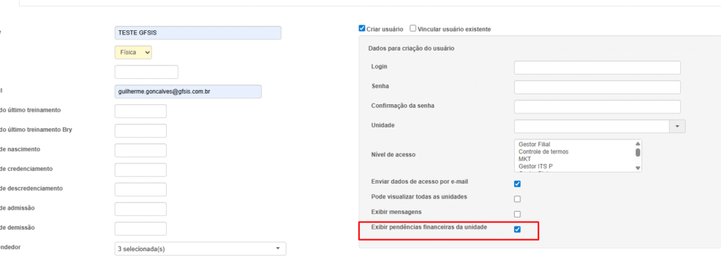 Foi realizado um ajuste interno para que o campo “Exibir pendência financeira da unidade“ seja exibido na criação do usuário através da tela de criação de vendedor.