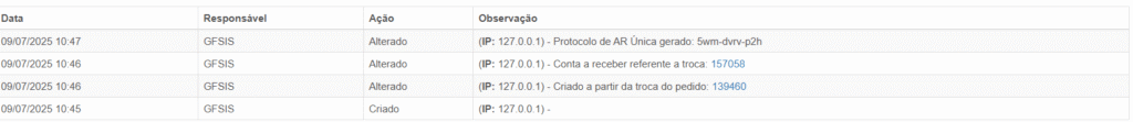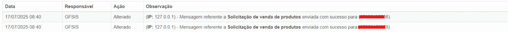 E no histórico da solicitação, fica registrado o envio das mensagens.