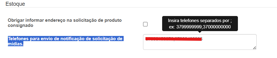 Foi adicionado um parâmetro “Telefones para envio de notificação de solicitação de mídias“ em Parâmetros do sistema -> Outros → Estoque.
