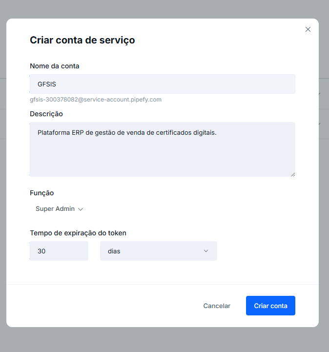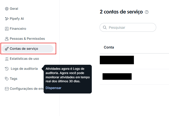 Para realizar a configuração do novo formato, deve seguir um processo de criação de uma “Conta de serviço“ dentro da plataforma da Pipefy, para coletar os dados de integração.