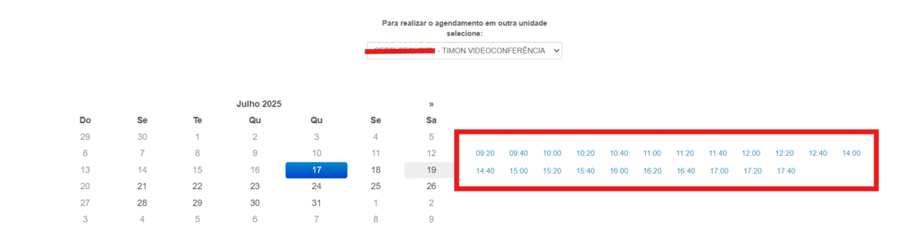 Podemos perceber que o horário de agendamento 14:40 para o dia 17/07/2025 não aparece pois já tem um agendamento marcado para este horário.